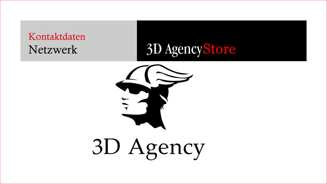 ADRESSE3D Agency oHG Meike Greiner und ZTM Robert Seidel Kattenpad 1A 27726 WorpswedeBÜROMontag - Freitag: 08:00 - 18:00 Uhrund nach VereinbarungKONTAKTTelefon: *49 (0)4792 310 268 Telefax: *49 (0)4792 310 260 E-Mail: info@3d-agency-store.de www.3d-agency-store.de